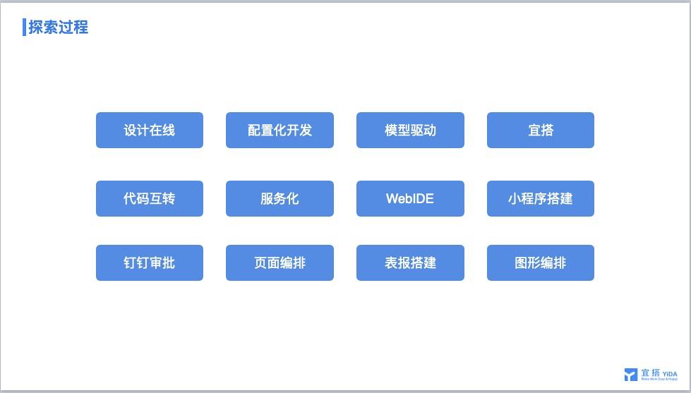 从 2015 年开始我们一步一步探索,做了很多很多,无论是技术上还是产品上。比如模型驱动、小程序搭建等。这里面的每一块都可以单出拿出来讲很久。这里我举几个例子简单描述下。