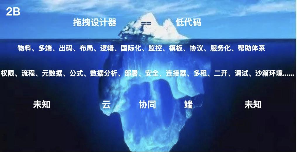 2B领域下的低代码适合用冰山理论来解释。部分人认为的,包括 5 年前的我也是这样认为的,拖拽设计器 == 低代码。后来在深入做了两年后,发现有物料、多端、出码、布局、逻辑、国际化、监控、模板、协议、服务化、帮助体系这么多功能要做。再往后做,要从 2B 的视角去看,就像之前微软的那边的局部,云、协同、端。