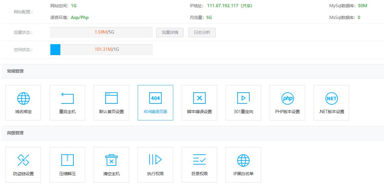具备域名绑定、重启主机、默认首页设置、404错误页面、脚本错误设置、301重定向、PHP版本设置、.NET版本设置、防盗链设置、压缩解压、清空主机、执行权限、目录权限、IP黑白名单、修改数据库密码、PhpMyadmin、清空数据库、外部链接管理等功能。