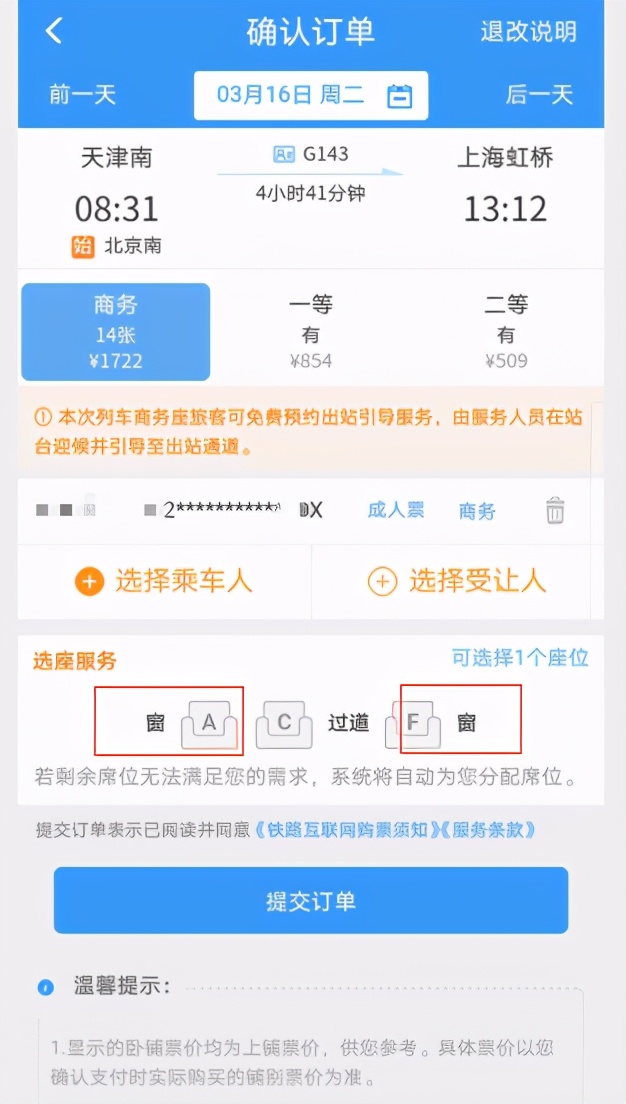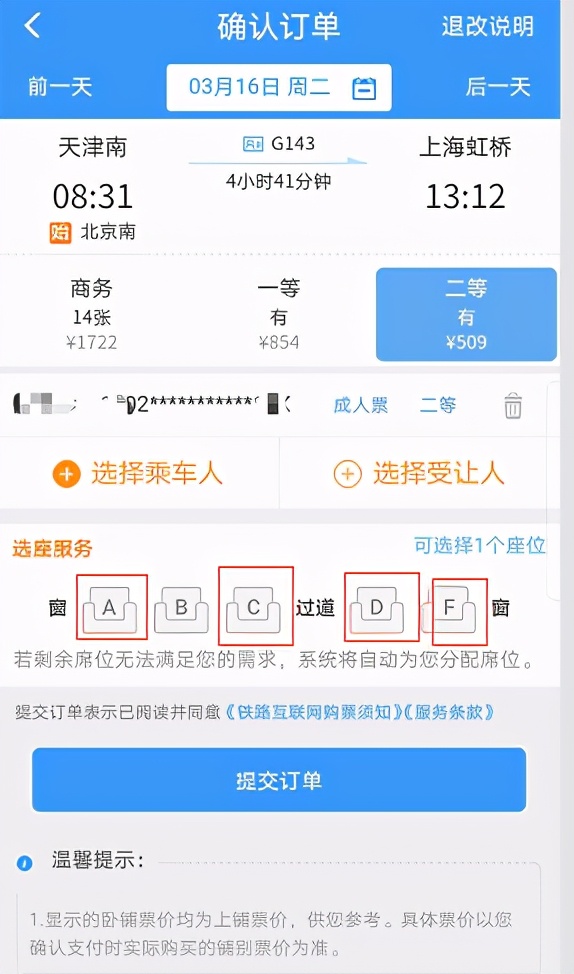 下图以从天津南站—上海虹桥高铁为例,看看我们网上订票时如何选座。