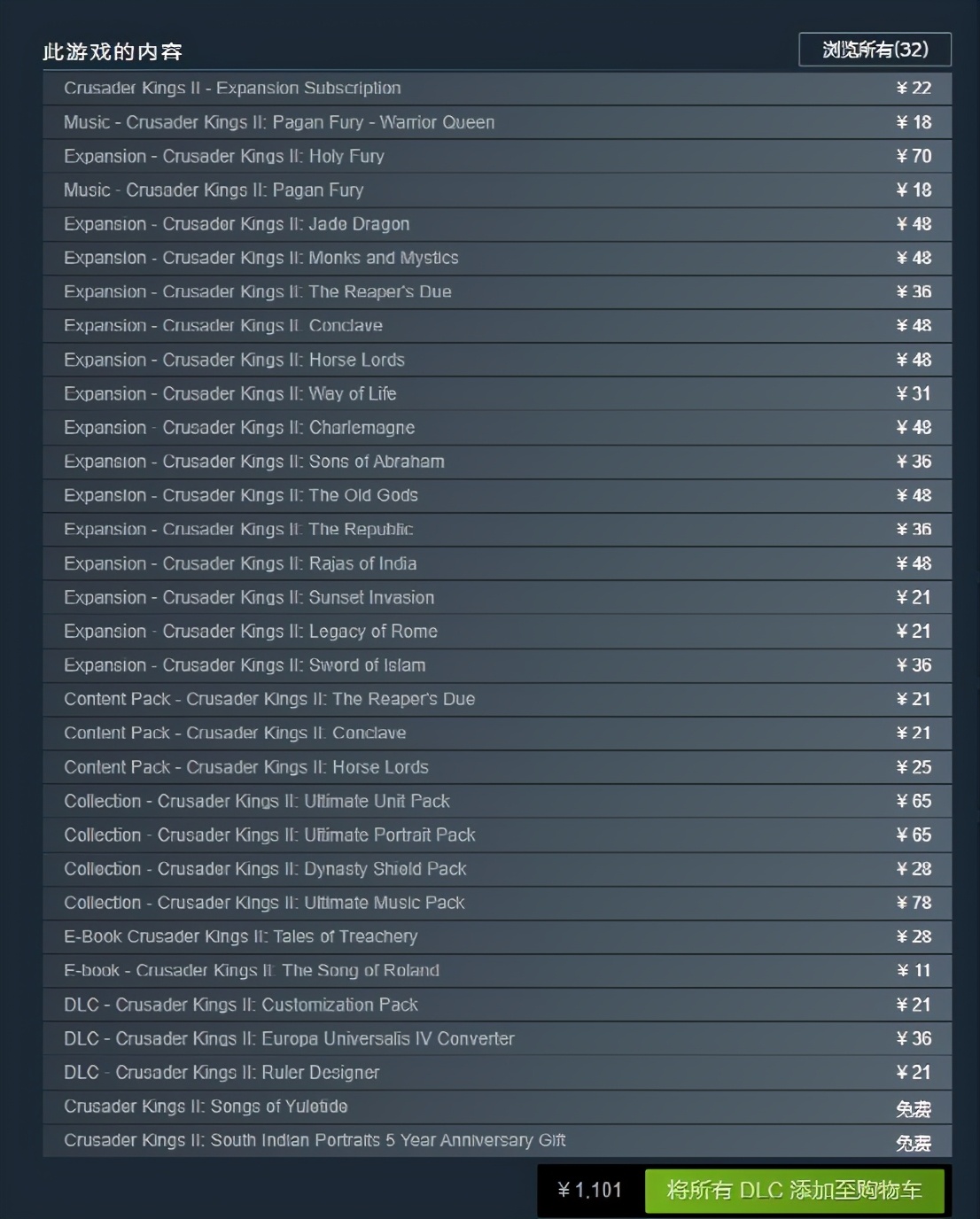 除了《群星》,前文所提到的《十字军之王2》的DLC更是多到令人发指的地步,其中许多还都属于扩展游戏玩法、切实影响玩家体验的DLC,如增加游牧政体的马王、增加新剧情的死神索命、生活之道DLC等,而这些林林总总的DLC加起来,合计可以达到上千元之多,是正常3A游戏售价的三倍。