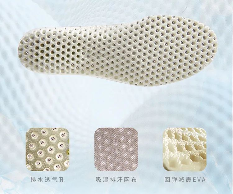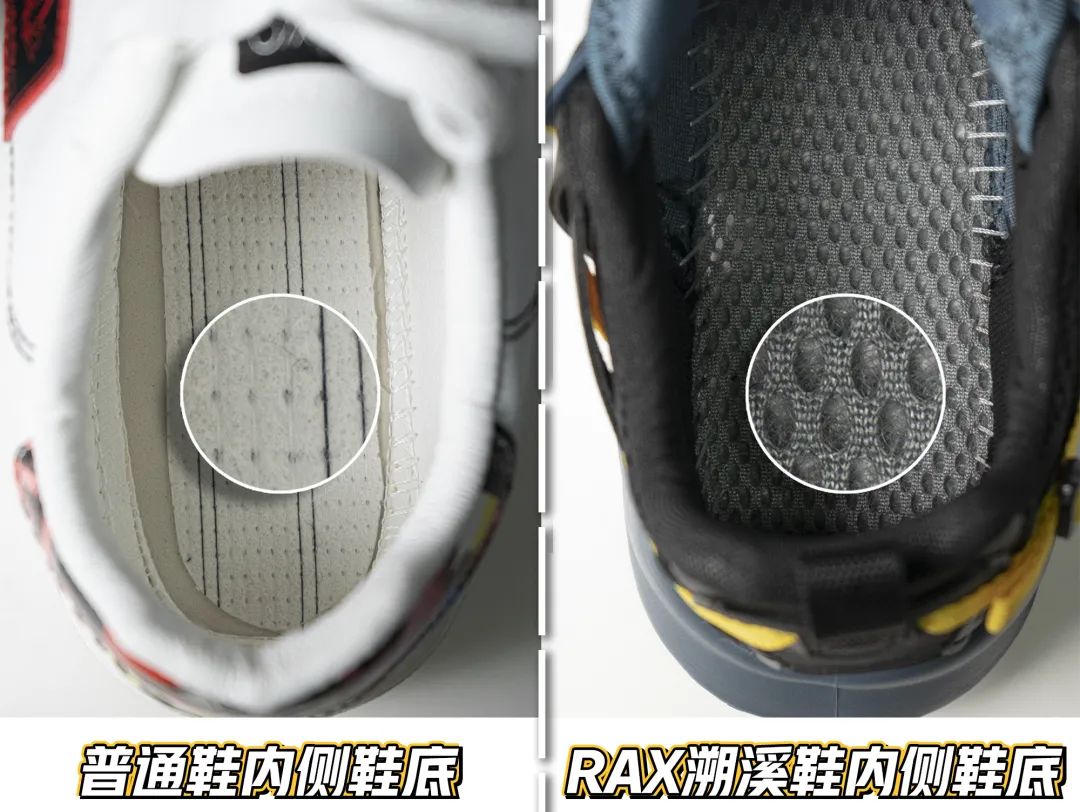普通运动鞋一般就是一层硬板,硌得慌还闷脚;RAX却选用了跟鞋面一样的弹力三层网,能直接跟鞋底侧边的排水孔联通!