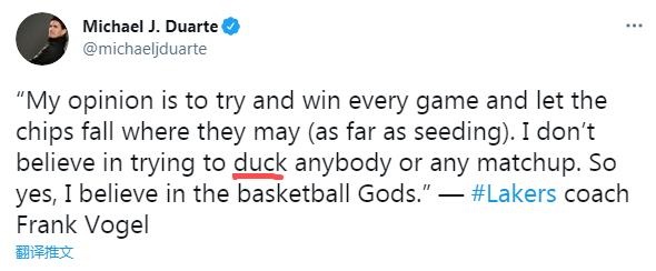 在NBA中,比如现在,为了一条更通顺的季后赛之路,一些手握主动权的球队通常会有意识挑选对手,这就引发了舆论的热议,说“谁谁有意避开哪队”,而通常所用的词就是“duck”。