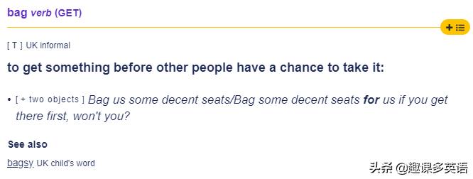 和美式英语不同的是,在英式英语中,“bag”作动词时,表示“抢先占有,快人一步”。