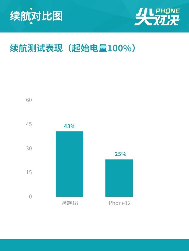通过5小时重度使用续航测试来对比检测两款手机的续航,具体测试项目为:拍照测试(30分钟)、视频播放测试(60分钟)、社交测试(30分钟)、即时通讯(30分钟)、网页浏览(30分钟)、游戏测试(60分钟)、在线音乐(30分钟)、电子书(30分钟)。魅族18最终剩余电量为43%,iPhone12剩余电量为25%。