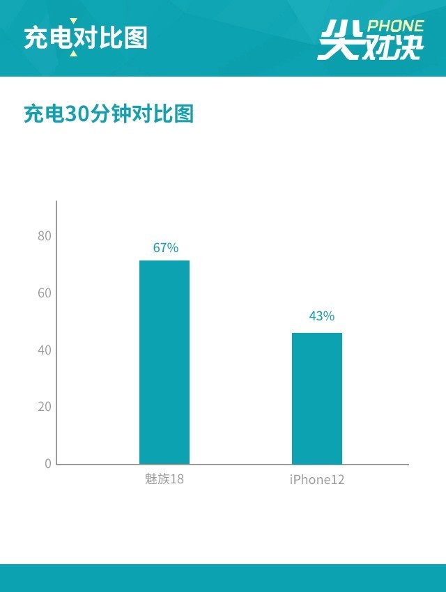 有线充电方面,魅族 18优于iPhone 12。30分钟有线充电测试来看,魅族 18最终充电67%,iPhone 12最终充电为43%。从充电表现看,魅族 18优于iPhone 12。总体续航表现看,魅族 18更优,特别是五小时续航后,手机能保持40%以上电量,日常使用一天不成问题。