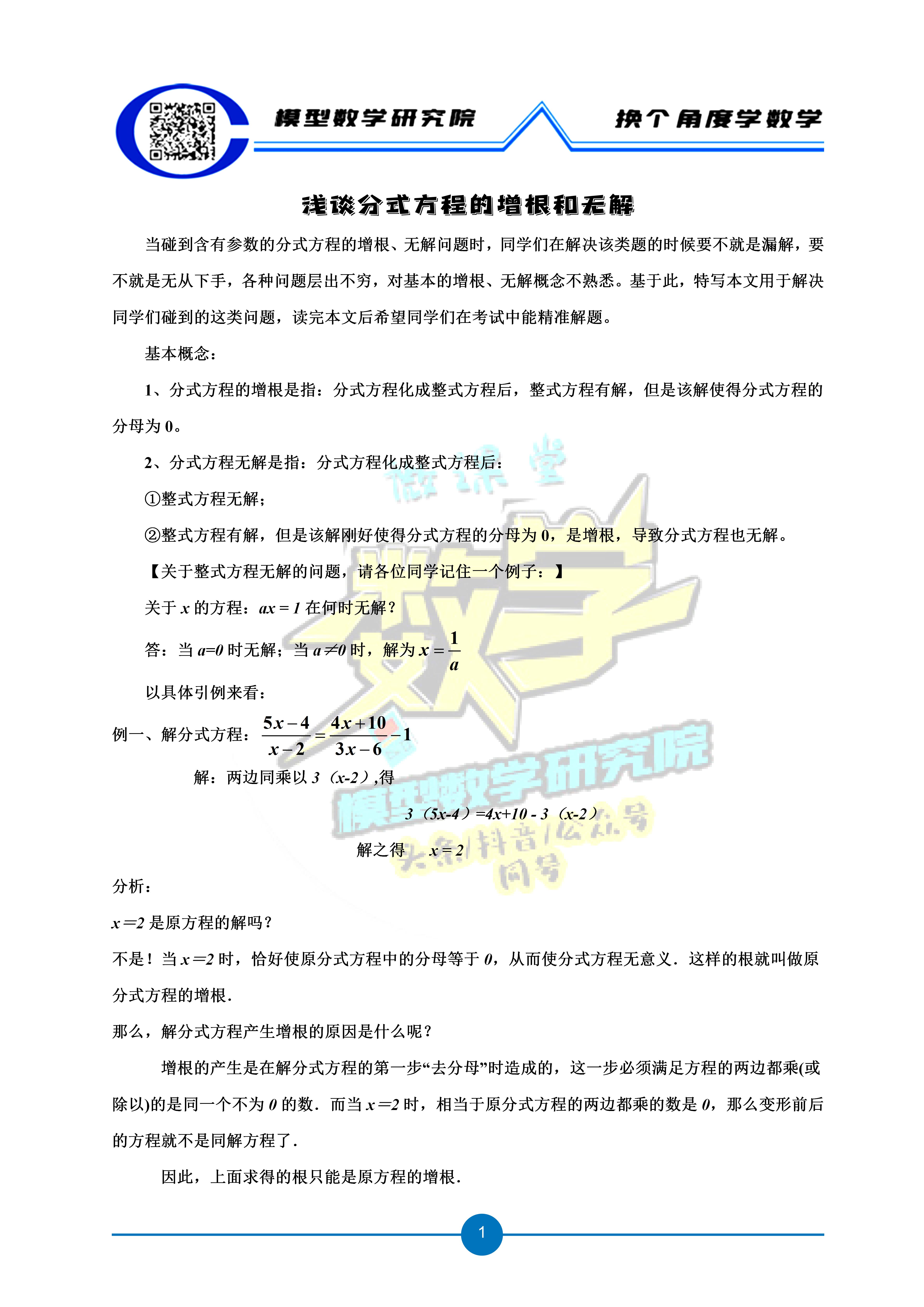 当碰到含有参数的分式方程的增根、无解问题时,同学们在解决该类题的时候要不就是漏解,要不就是无从下手,各种问题层出不穷,对基本的增根、无解概念不熟悉。基于此,特写本文用于解决同学们碰到的这类问题,读完本文后希望同学们在考试中能精准解题。