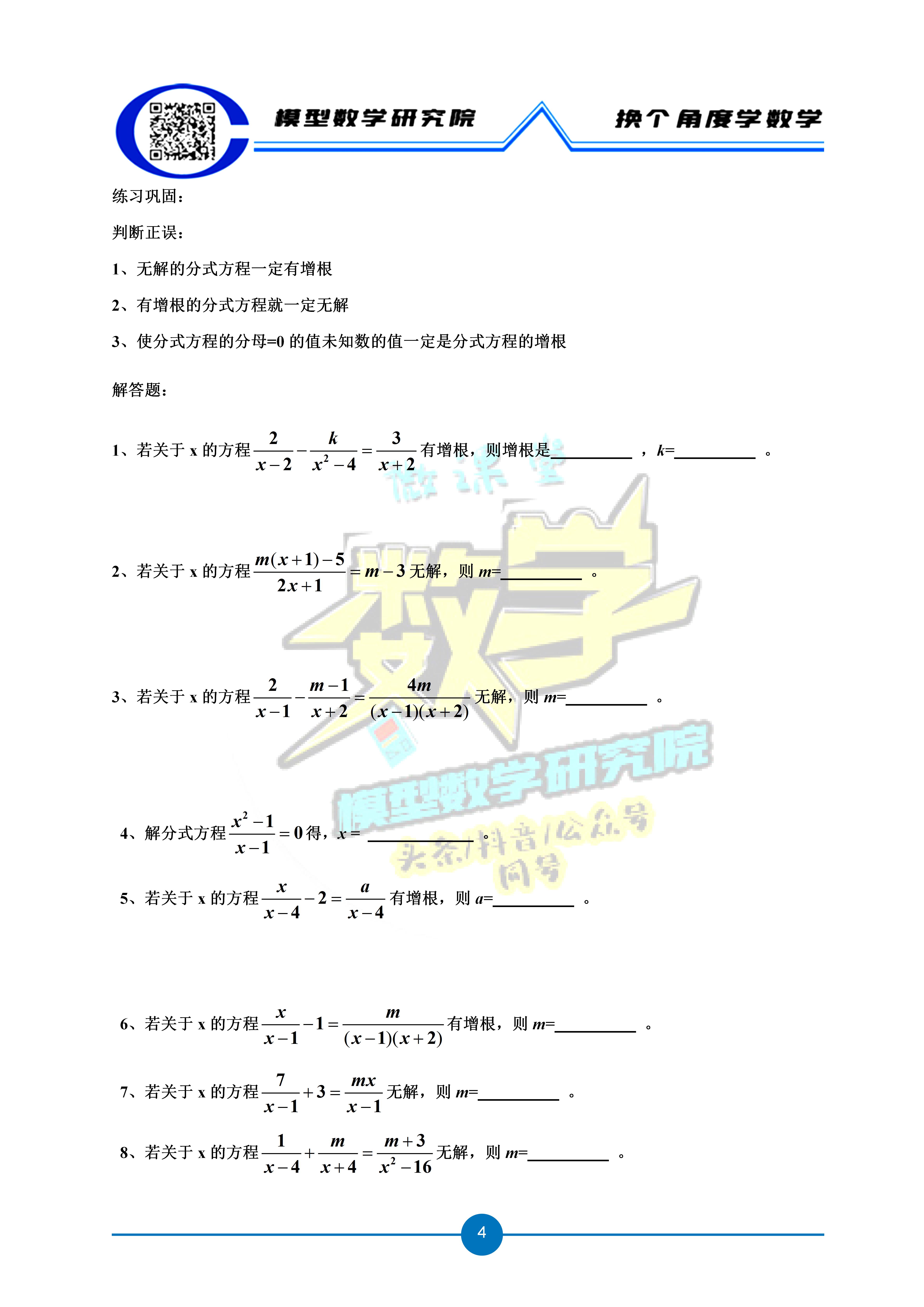 1、分式方程的增根是指:分式方程化成整式方程后,整式方程有解,但是该解使得分式方程的分母为0。