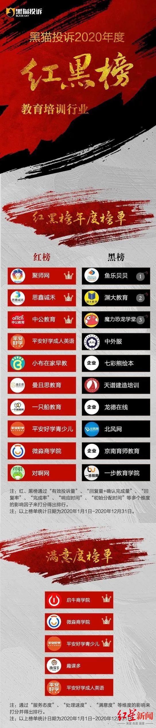 近日,黑猫投诉平台发布了2020年度教育培训行业年度红黑榜。