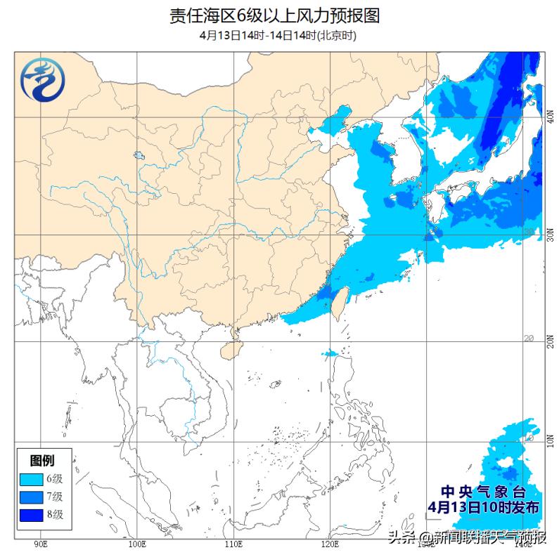 13日白天至14日白天,渤海、黄海大部海域、东海大部海域、台湾海峡将有6~7级、阵风8级的偏北风或东北风。