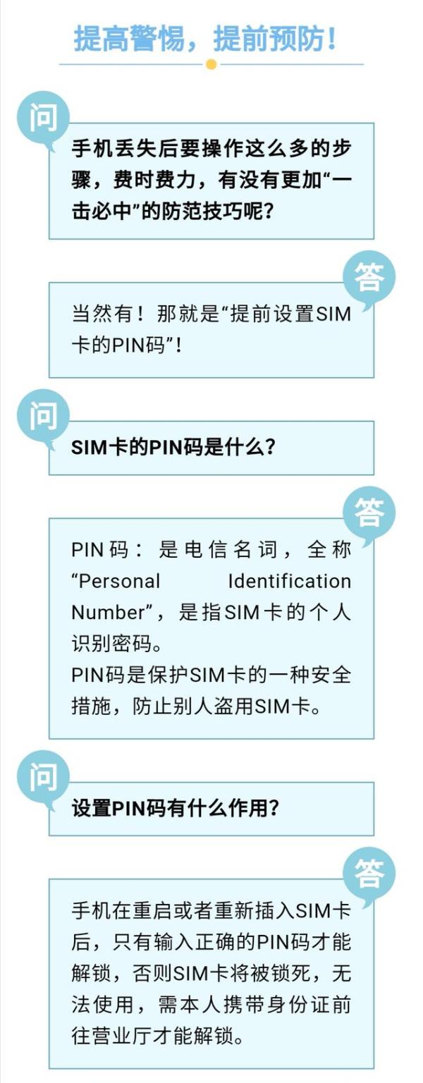 设置SIM 卡 PIN 码可以有效保护公民个人信息与财产,切勿使用过于单一、简单的密码,以防被不法分子有机可乘。