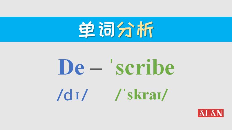 pressure这个单词还是很简单的,下面来看看第二个单词——describe吧!这个单词是一个很实用的动词,中文意思是“描述”。它的名词形式是description。话不多说,回到单词本身,它拥有两个音节,分别是de和scribe,重读在第二个音节。基本了解了这个单词之后,我们从每个音节看起吧!