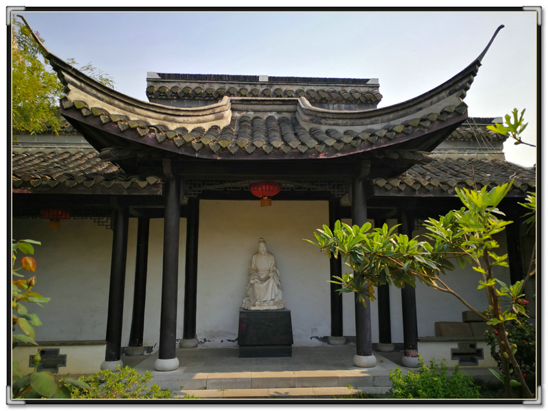 园中绿植遍地,花木扶疏。南园墙内置半廓,中部凸起,檐柱突出。廓内安放沈括全身坐像:青衣便髻,神态安详,左手紧握陨石,右手覆于书上,双目微闭,若有所思。