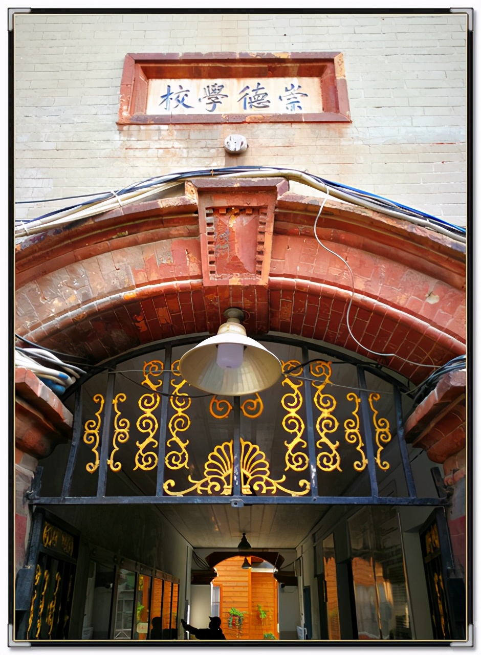 教堂的后面,是红、青两色砖砌的四层楼房,这是当年的教会学校,门首横额石上刻“崇德学校”四字,顾名思义,这是一所具有中国传统文化与基督教结合的学校。
