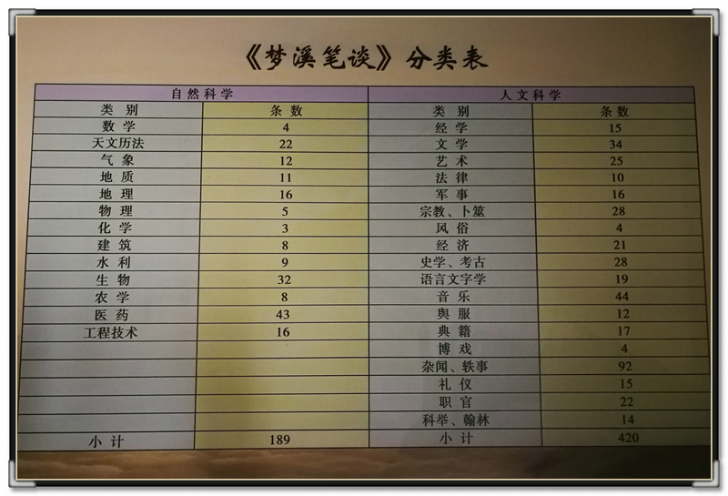 沈括晚年在梦溪园潜心撰著,完成了不朽著作《梦溪笔谈》。这是一部百科全书式的著作,博大精深,内容宏富,共列有条文609条,既包括天文、历法、数学、物理、地理、地质、生物、化学、农学、医药等自然科学知识,也包括文学、史学、音乐、美术等人文科学知识,价值巨大。它不但是沈括平生科学研究成果的结晶,也观察和记录了古代和宋代的科学技术成就,是沈括所处时代最新科技水平的总结。