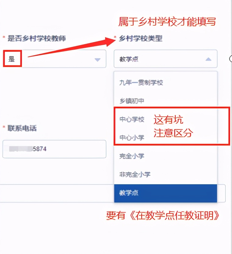 乡村学校类型:&34;乡村学校教师一栏选“是”才能填写,如实填写。如果你是小学教师,并选“教学点”的话,要注意“中心学校”和“中心小学”的区别,如果分不清就很容易踩坑。