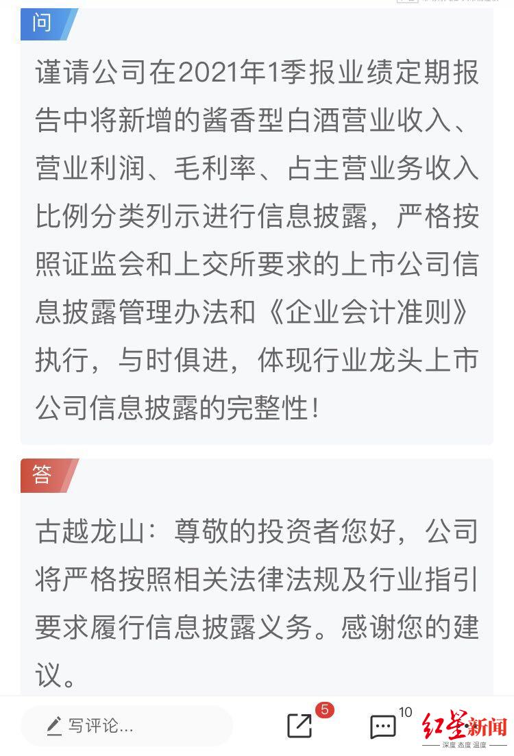 古越龙山涉足酱酒,也引起了资本市场的关注。在一些投资交流平台,有股民多次去“碰瓷”上市公司,比如投资者反复去问董秘,要求公司在业绩定期报告中新增酱香型白酒营业收入、营业利润、毛利率、占主营业务收入比例分类列示进行信息披露等。