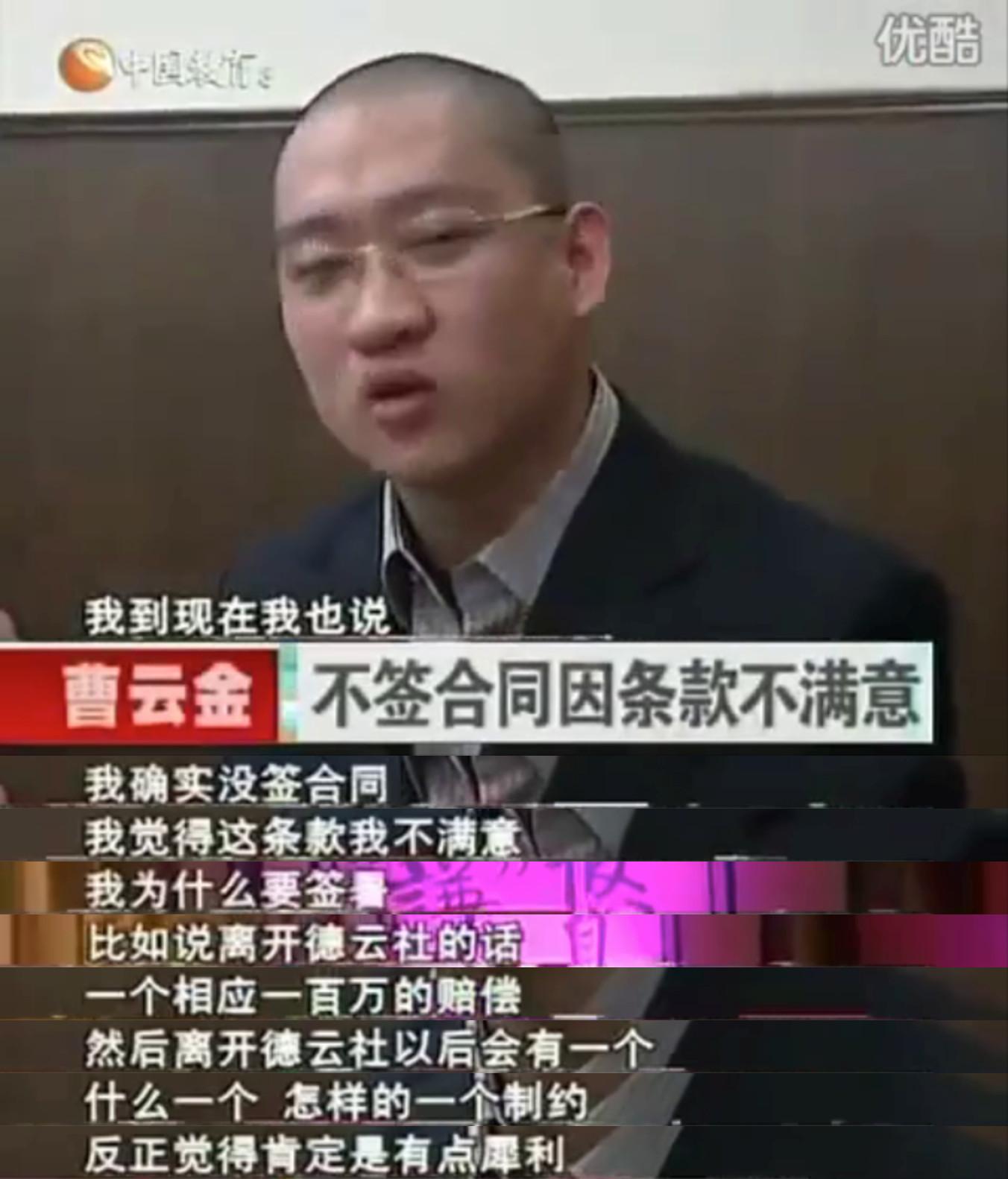 对于合同问题,曹云金没有遮遮掩掩,他说:“我确实没签合同。我觉得这个条款我不满意,如果离开德云社的话,要赔偿100万,具体离开德云社有个相应的什么的制约,具体的我也不愿透露细节,反正有点犀利。”