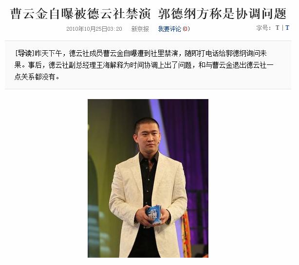 对于这个事儿,多年后曹云金接受采访时说:“他问我能做到什么?我说我不在乎任何的收入,我说我(在德云社)白演,演完了给不给费用无所谓,然后我想不管多少我演就行。但是忽然有一天我去剧场演出,他告诉我你不要演了,你每一次的演出都要通过演出部。我不知道演出部是一个什么部门,当时都没有这样一个部门,我很奇怪。因为我每次要在剧场演出,我都会提前在微博上发(预告),那个时候就有大批去购票的粉丝。突然禁演我了,我得给粉丝个交代啊,那天我就在新浪发了一个微博,我说‘现在禁演我了,我不能能登台了,对不起各位’。因为粉丝都已经买了票了。”
