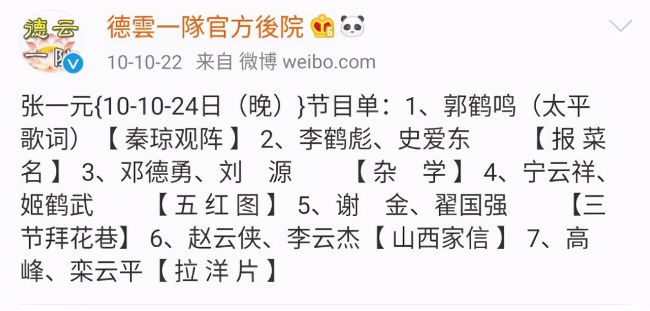 自从停业整顿后,老郭加强了德云社管理;10月18日,把德云社所有演员分成四队:德云1队、德云2队、德云3队、德云青年队。每队演员的受益和演出效果挂钩。张一元10月24日的演出,由德云1队负责,在10月22日已经安排并公布了节目单。