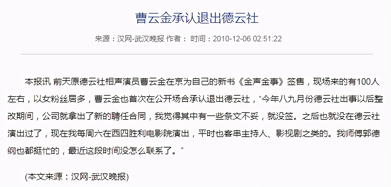 2010年11月15日,腾讯娱乐还发文说,曹云金接受《真维斯娱乐现场》编导采访时说没有离开德云社的意思:“我没有退出北京德云社,如果德云社需要我回去演出,我马上就回去,我永远是我师父的徒弟,不要有的人没事挑事!”