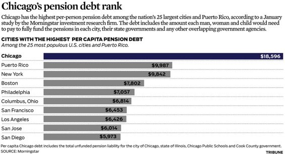图为2014年芝加哥市养老金负债排全美第一。图源:《芝加哥论坛报》
