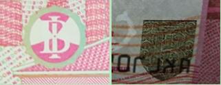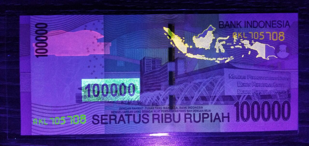 100000卢比正面左上角的正反对印图案BI 是由印度尼西亚银行(BANK INDONESIA)第一个字母构成的。右下角是印有BI字母等图案的珠光变色油墨印刷而成。