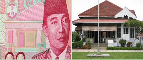 苏加诺头像旁左侧建筑是他曾经的在印尼楠榜省朋古鲁的旧居。