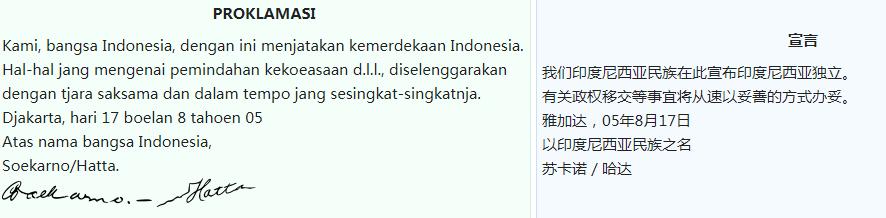 需要说明的这里独立宣言采用的历法是印度尼西亚皇纪而不是公历,所以记录在独立宣言文本上的年份是2605年而不是1945年。