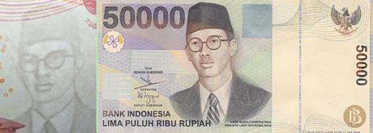 这张纸币上另外一个人物就是水印人物---印度尼西亚作曲家威吉·鲁多尔夫·苏普拉特曼。顺便提下前一个版本的印尼50000卢比纸币正面人物就是这位印尼作曲家。