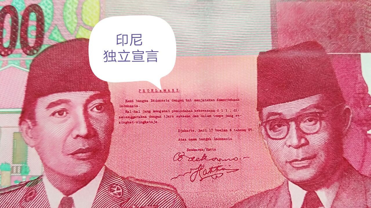 苏加诺和哈达两人中间的文字部分是用印尼语写的1945年印度尼西亚独立宣言。