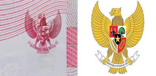右上角是印度尼西亚的国徽图案,一只金色的昂首展翅的印度神鹰,象征印度尼西亚人民的光荣和胜利。