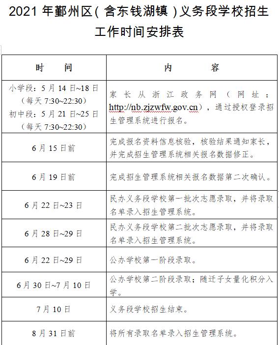 (四)网上报名时间:小学段5月14日~5月18日每天7:30~22:30;初中段5月21日~5月25日每天7:30~22:30。报名网址为http://nb.zjzwfw.gov.cn。