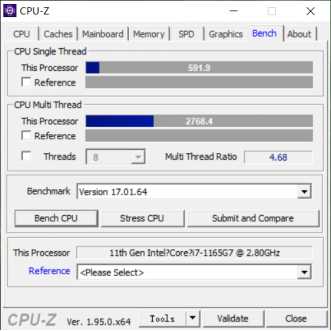 通过CPU-Z1.95进行性能测试,单线程分数为591.9,多线程分数为2768.4。(以下所有测试,均开启性能模式进行)