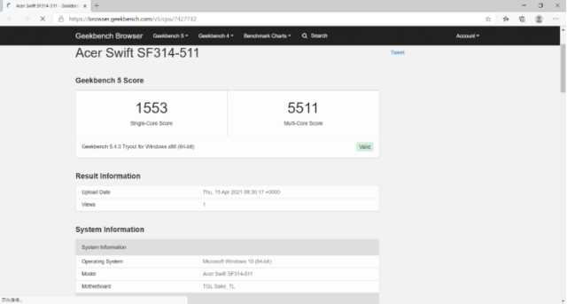 Geekbench5是目前流行的跨平台处理器性能测试软件,分为整数、浮点和加密三个子项目。此项测试中,宏碁非凡S3单线程得分为1553,多线程得分为5511。