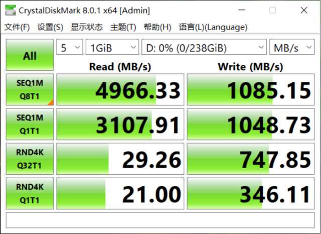 宏碁非凡S3搭载了群联主控的512GB容量PCIe4.0固态硬盘,使用CrystalDiskMark进行测试,可以看到凭借着PCIe4.0协议的超大带宽,读取速度接近5000MB/s,相比于PCIe3.0协议的固态硬盘优势较为明显。