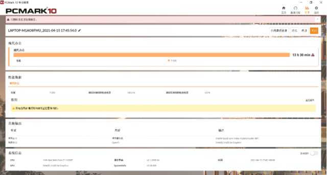 模拟日常使用,通过Fn+F快捷键组合切换至均衡模式,屏幕亮度设定为40%,开启Wi-Fi;运行PCMark10的现代办公场景续航测试,最终取得了13小时30分钟的成绩,从结果上看,宏碁非凡S3能够较为完美的应对大多数移动办公需求。