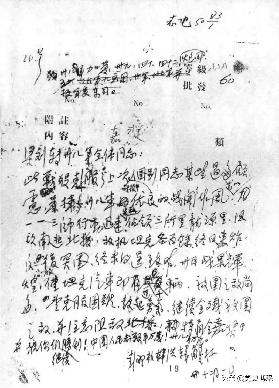 ◆彭德怀亲自起草的38军嘉奖电报原稿。