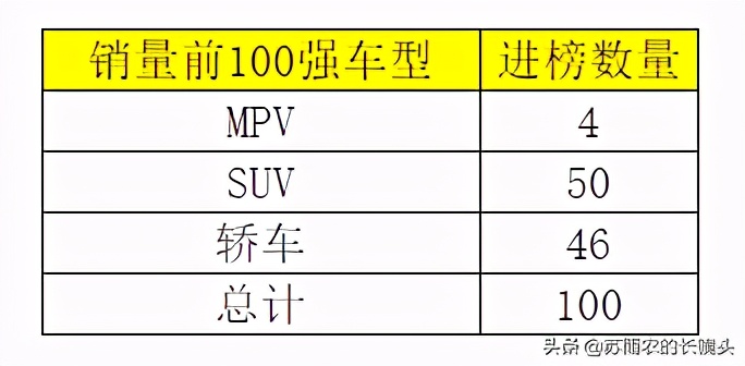 由于国内汽车市场车型众多,我们将考察的车型限定在销量前100强。通过简单统计,前3季度销量前100强中,轿车进榜数量为46款,SUV车型50款,MPV则只有4款。从进榜数来看,轿车、SUV进榜数量基本平分秋色,MPV则显得有些势单力孤。但前10名中只有两款SUV,仍然不能撼动轿车的统治地位。