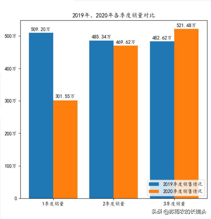 从2019、2020年各季度销量对比图中不难看出,国内乘用车销量在一季度出现断崖式下跌。从二季度开始,国内乘用车销量开始迅速恢复。相较去年同期,二季度单季度销量差距仅在15万辆左右。进入三季度,国内乘用车各月销量同比增长明显加快,销售521.48万辆,较去年同期增加近40万辆。