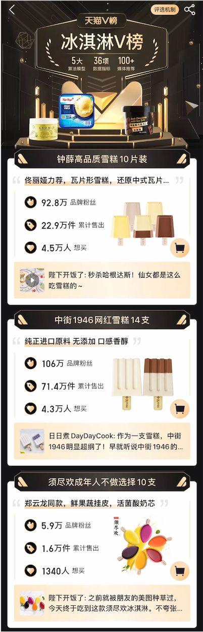 在天猫近期发布的官方购物指南《天猫V榜年度单品2020》的冰淇淋V榜中,就不乏国产网红冰淇淋的身影。