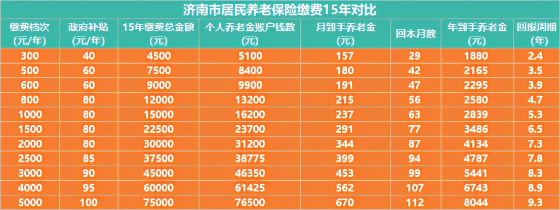 最低档300元缴费档次,不到2年半的时间就能回本,剩下的便是享受养老保险政策带来的实惠,而最高档5000元缴费的,则需要9年多才能回本,回报周期更长;