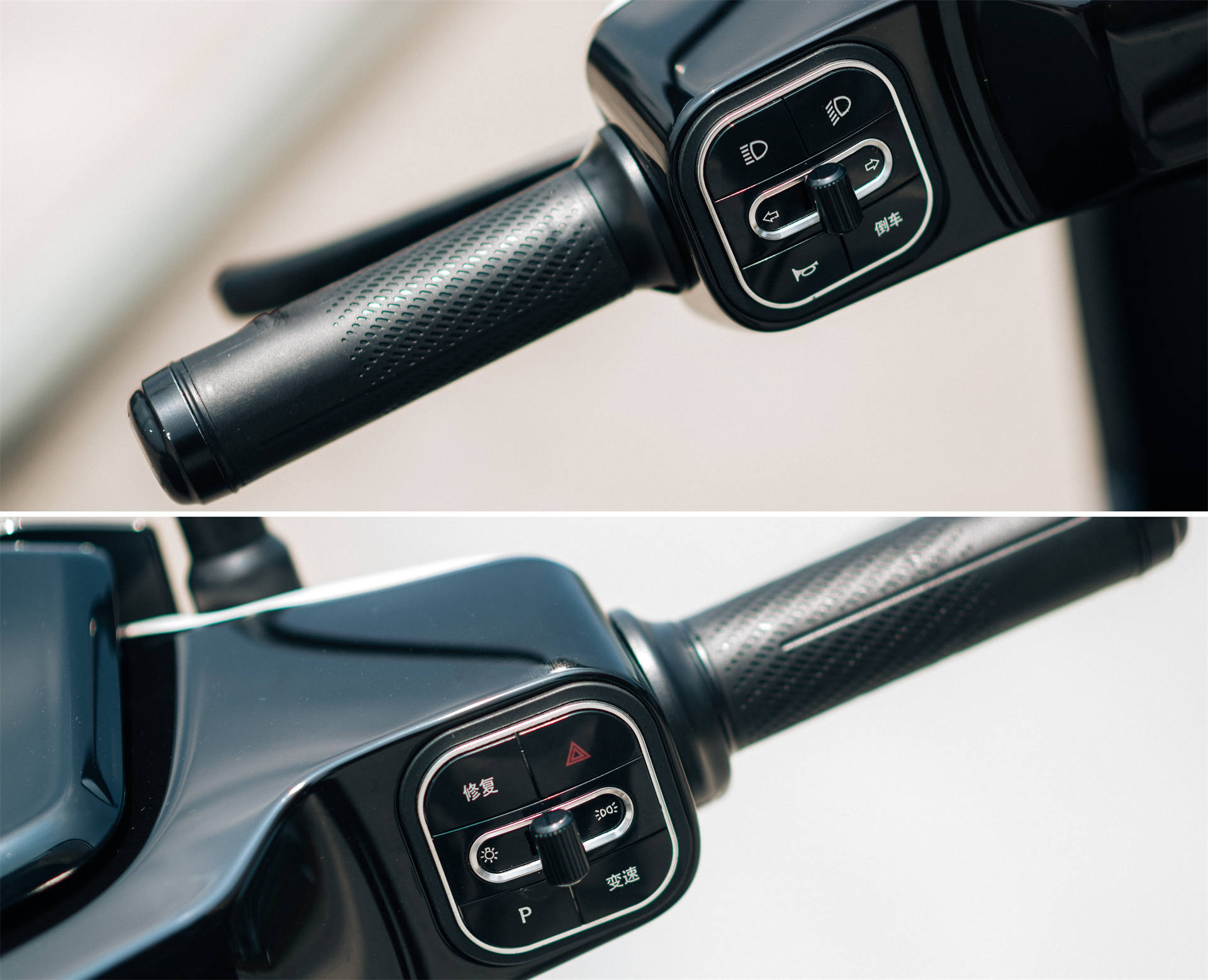 左右手柄的实体按键布局我也是十分的喜欢,左边手把为转向灯、远光灯、喇叭以及倒车按键,而右手柄旁则是修复、灯光、危险指示灯、P档以及档位变速按键,就操作便捷性来说还是方便很多的,骑行时几乎不看实体按键也可以轻松的用手指扣到每一个按钮实行“盲操作”,保证行车的安全。