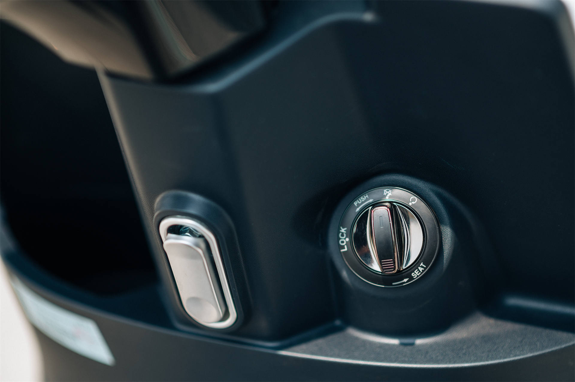 在钥匙孔位采用的是一个一体旋钮锁,周围会有灯光提示,哪怕是夜间也能快速地找到孔位启动电动车,而且钥匙孔位采用的是滑开设计,避免孔位被雨淋湿导致生锈。