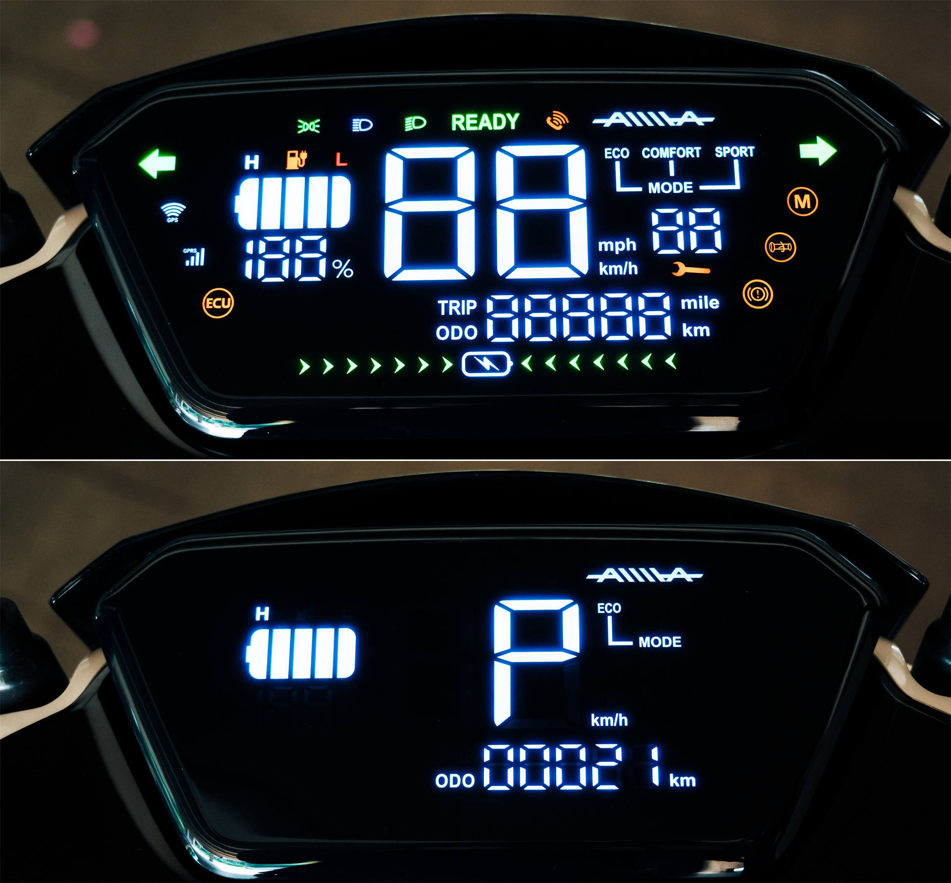 爱玛A500的一体式中控部分也相当给力,不仅采用悬浮式的设计让视觉感官更强烈,而且采用的还是一块11.8英寸的高清全面屏,在仪表盘上电池信息、车速、档位以及车辆状况等都相当清晰地显示出来,观感体验相当舒服,哪怕是白天的强光照射也丝毫不会影响用户观看仪表盘上的信息。