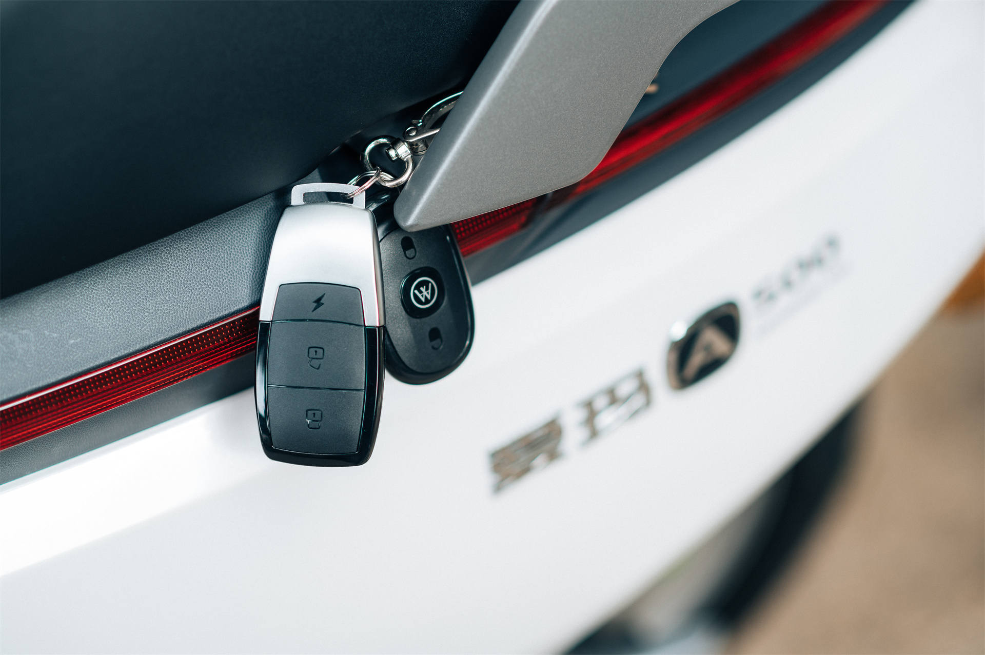 随车配备的是两把实体钥匙和两把智能钥匙,车上用一套,家里保留一套避免钥匙丢失带来麻烦,而且这把智能钥匙仅需车主靠近A500时就会自动解锁,离开时自动落锁,亦可通过NFC刷卡方式进行解锁和落锁,相当方便。