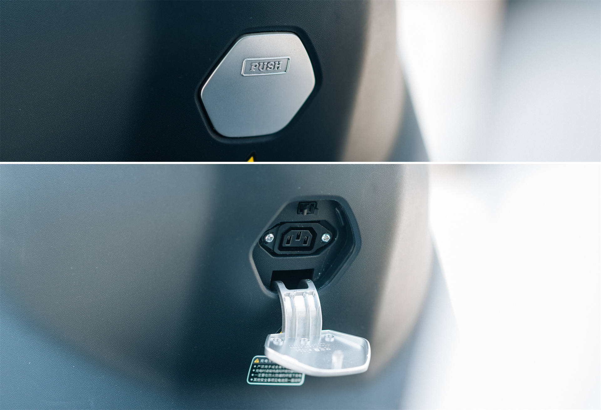 坐垫打开后还有一个32升的储物箱,我觉得空间可以存放一个书包什么的完全是充裕的,甚至下班买一大堆菜放到这个储物箱里,也是完全可以满足。在储物箱的后方还配有一个空气开关按钮,防止长时间放置电动车时的电量损失,维持续航水平。