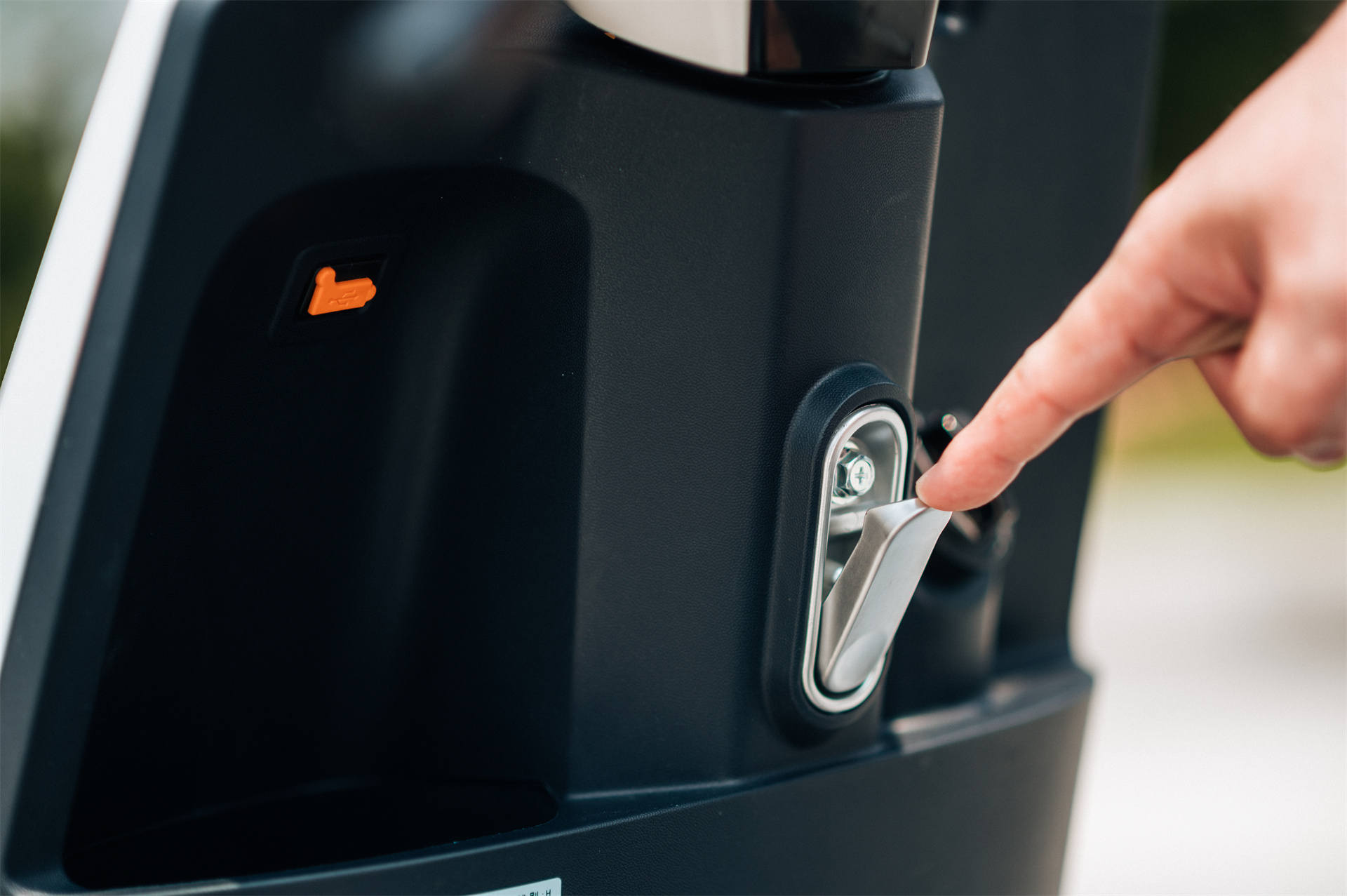 爱玛A500上还有相当多的小细节值得肯定,比如除了两个支撑架之外,在车身的侧面还提供两个隐藏式的脚蹬,当需要搭乘乘客时就可以方便后面的人使用。