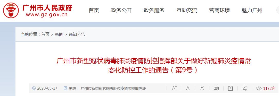5月17日,广州市政府网站发布关于做好新冠肺炎疫情常态化防控工作的通告(第9号),以下为通告原文: