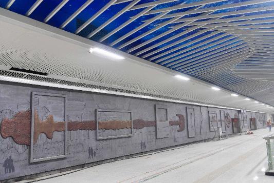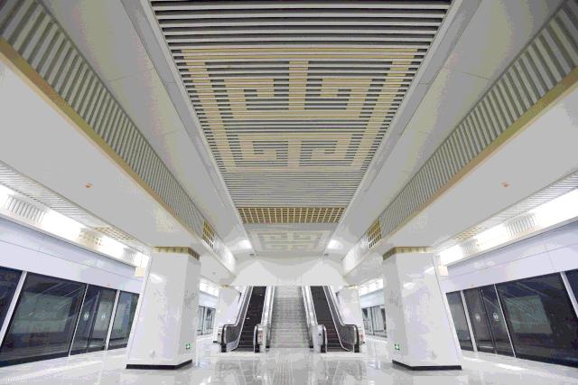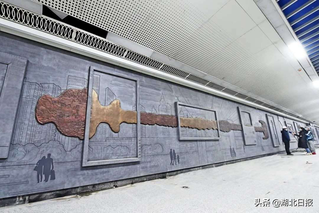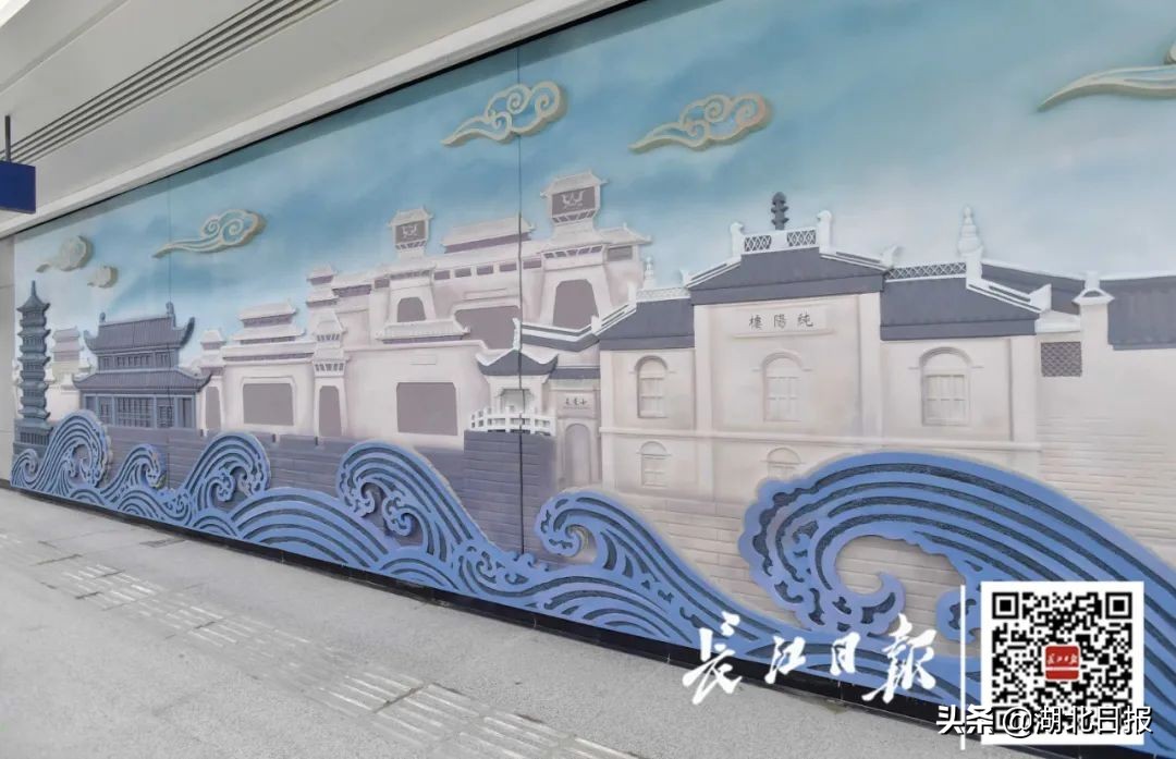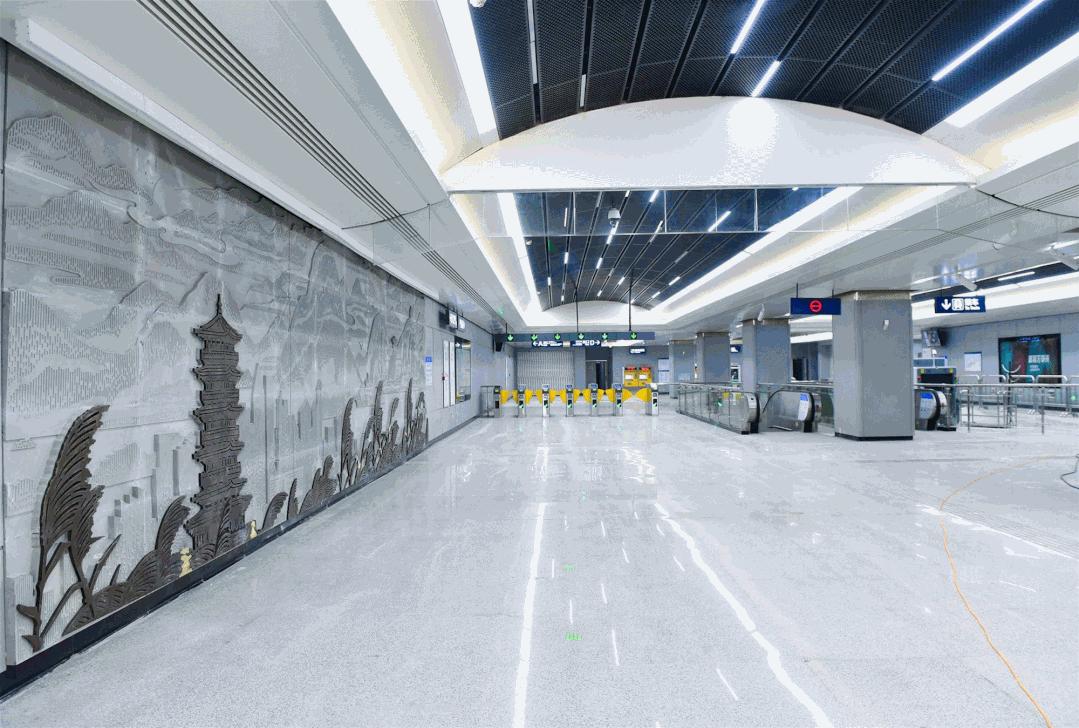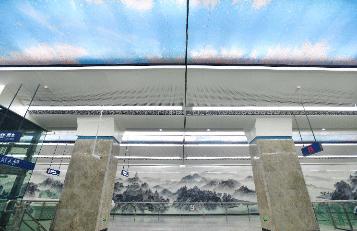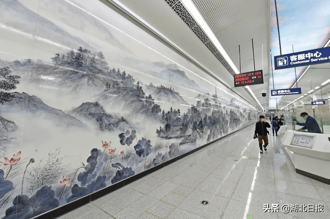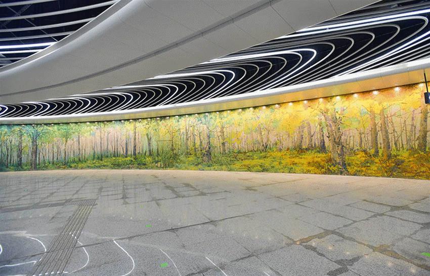 长60米、高4.5米,车站的一整面超大的艺术墙则是水墨画的风格,是目前国内最大的地铁车站艺术墙。